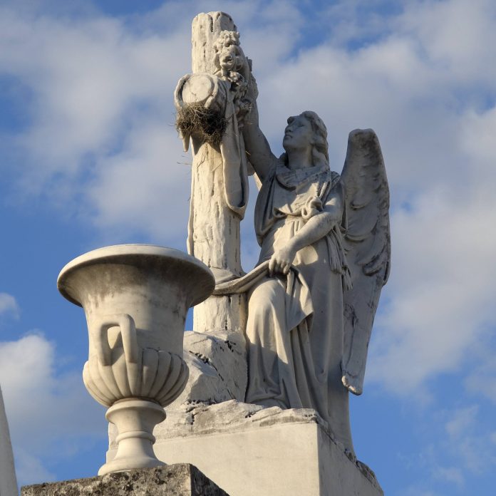 Ánima alada. Los ángeles en el arte funerario fungen como guardianes espirituales y mensajeros entre el cielo y la tierra. La cruz es fe y esperanza en la resurrección. Los objetos como las guirnaldas, comunican ideas de cuidado, esperanza y memoria eterna.