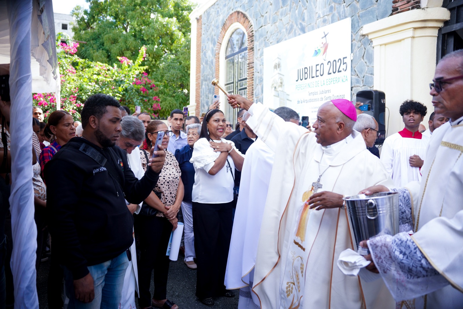 A su llegada al templo, Monseñor Manuel Ant. Ruiz realizó la aspersión en la Puerta Santa, bendiciendo a los fieles y sacerdotes, gesto que selló espiritualmente el cierre del jubileo.