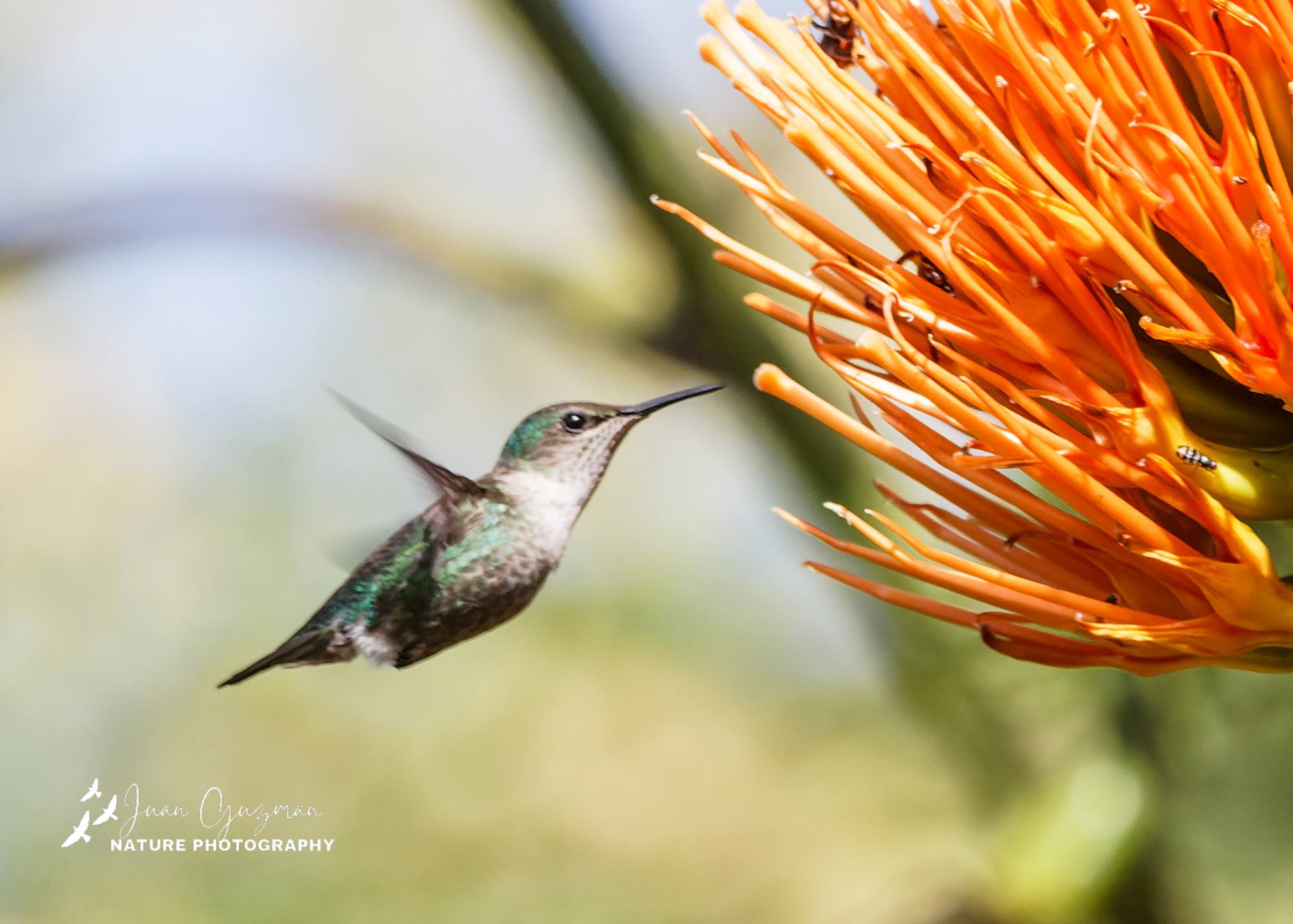 Territorial y muy activo, especialmente durante la alimentación en flores tubulares.